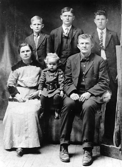 The woman on the left is the youngest daughter of John R. Hardy, Ida Pearl Hardy Hutson. On the right is her husband, John Pierce Hutson, and standing, L to R, are sons Quincy Harrel, John Barney, and Andrew Clyde. The baby is Coy Lee. This was taken probably around 1918. They lived in Pike Co., AR, later moving to Hempstead Co.