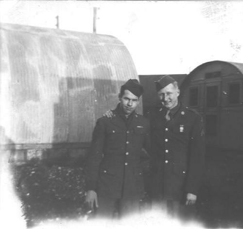 While serving in England in separate units prior to the D-Day invasion, two of my uncles met in England for this photo. Uncle Denver Hardy, left, my dad’s younger brother, went on to fight in France and Germany as an infantryman in the Third Armored Division. Uncle L. W. (Chip) Ferguson, right, my mother's younger brother, served in a Headquarters Company. This was taken in Sheffield, England. Denver returned from the war and worked for Humble Oil Co. for many years before retiring. Chip worked for Illinois Central Railroad in Shreveport, LA before his retirement. (2-29) |